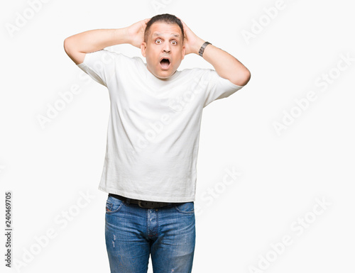 Middle age arab man wearig white t-shirt over isolated background Crazy and scared with hands on head, afraid and surprised of shock with open mouth