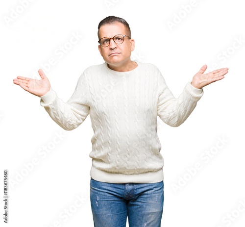Middle age arab man wearing glasses over isolated background clueless and confused expression with arms and hands raised. Doubt concept.