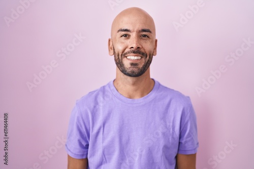Middle age bald man standing over pink background looking positive and happy standing and smiling with a confident smile showing teeth