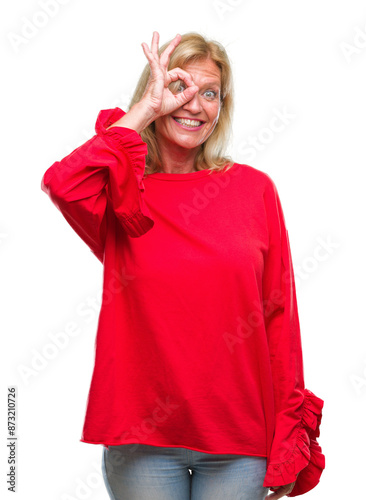 Middle age blonde woman over isolated background doing ok gesture with hand smiling, eye looking through fingers with happy face.