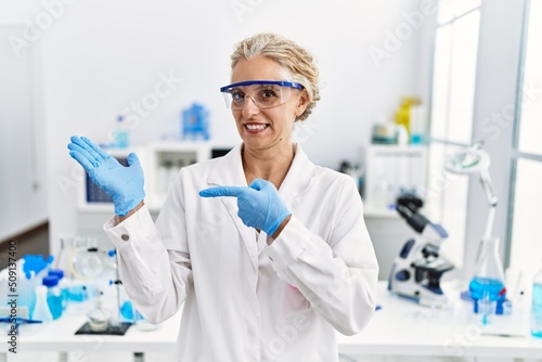 Middle age blonde woman working at scientist laboratory amazed and smiling to the camera while presenting with hand and pointing with finger.