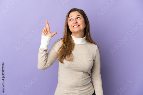 Middle age Brazilian woman isolated on purple background with fingers crossing and wishing the best