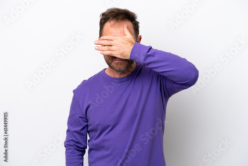 Middle age caucasian man isolated on white background covering eyes by hands. Do not want to see something