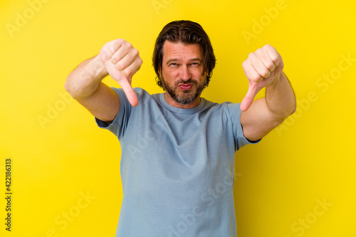 Middle age caucasian man isolated on yellow background showing thumb down and expressing dislike.