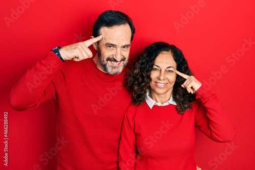 Middle age couple of hispanic woman and man hugging and standing together smiling pointing to head with one finger, great idea or thought, good memory