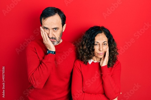 Middle age couple of hispanic woman and man hugging and standing together thinking looking tired and bored with depression problems with crossed arms.
