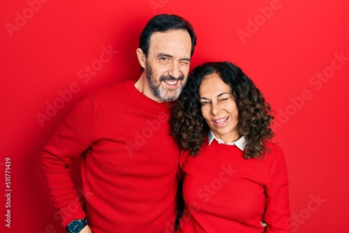 Middle age couple of hispanic woman and man hugging and standing together winking looking at the camera with sexy expression, cheerful and happy face.