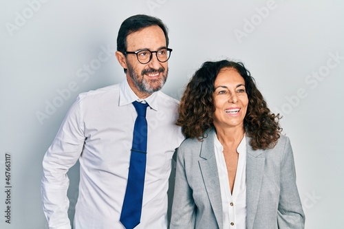 Middle age couple of hispanic woman and man wearing business office uniform looking away to side with smile on face, natural expression. laughing confident.