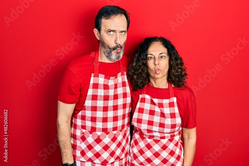 Middle age couple of hispanic woman and man wearing cook apron making fish face with lips, crazy and comical gesture. funny expression.