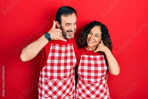 Middle age couple of hispanic woman and man wearing cook apron smiling doing phone gesture with hand and fingers like talking on the telephone. communicating concepts.