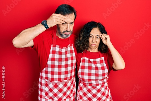 Middle age couple of hispanic woman and man wearing cook apron worried and stressed about a problem with hand on forehead, nervous and anxious for crisis
