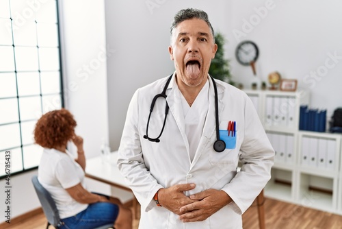 Middle age doctor man at the clinic with a patient sticking tongue out happy with funny expression. emotion concept.