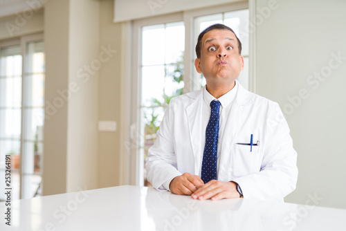Middle age doctor man wearing medical coat at the clinic puffing cheeks with funny face. Mouth inflated with air, crazy expression.