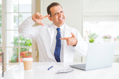 Middle age doctor man wearing white medical coat working with laptop at the clinic smiling making frame with hands and fingers with happy face. Creativity and photography concept.