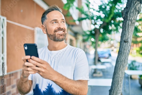 Middle age handsome man smiling happy using smartphone at the city.