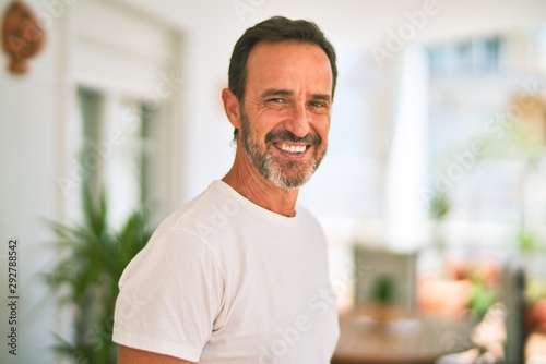Middle age handsome man wearing casual t-shirt standing on terrace smiling