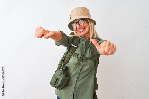 Middle age hiker woman wearing backpack hat canteen glasses over isolated white background approving doing positive gesture with hand, thumbs up smiling and happy for success. Winner gesture.