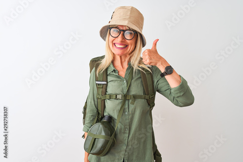 Middle age hiker woman wearing backpack hat canteen glasses over isolated white background doing happy thumbs up gesture with hand. Approving expression looking at the camera showing success.