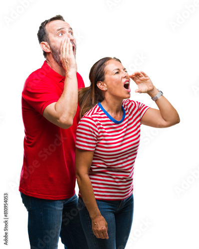 Middle age hispanic couple in love over isolated background shouting and screaming loud to side with hand on mouth. Communication concept.