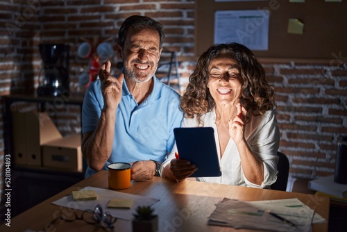 Middle age hispanic couple using touchpad sitting on the table at night gesturing finger crossed smiling with hope and eyes closed. luck and superstitious concept.
