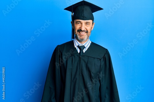Middle age hispanic man wearing graduation cap and ceremony robe with a happy and cool smile on face. lucky person.