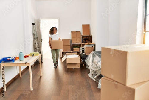 Middle age hispanic woman smiling confident holding cardboard box at new home