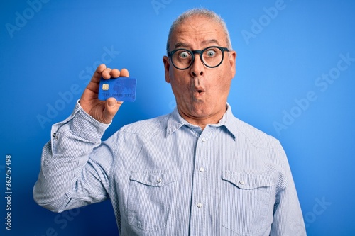 Middle age hoary man wearing glasses holding credit card as money to do payment scared in shock with a surprise face, afraid and excited with fear expression