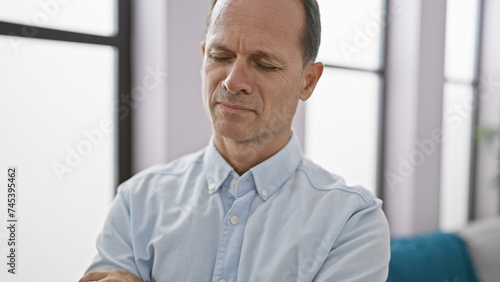 Middle age man, with a serious face, standing in the sunny warmth of his cozy home living room, exuding a mature and handsome expression.