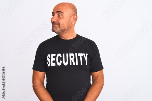 Middle age safeguard man wearing security uniform standing over isolated white background smiling looking to the side and staring away thinking.