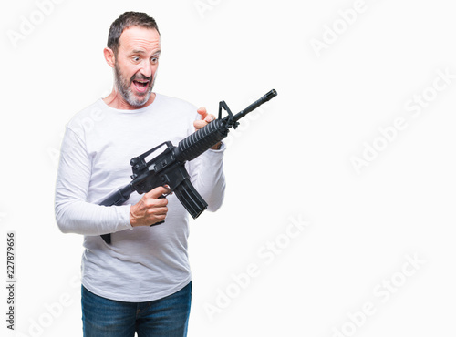 Middle age senior hoary criminal man holding gun weapon over isolated background very happy pointing with hand and finger