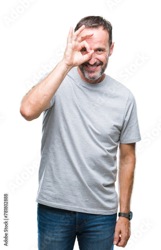 Middle age senior hoary man over isolated background doing ok gesture with hand smiling, eye looking through fingers with happy face.