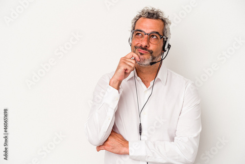 Middle age telemarketer caucasian man isolated on white background looking sideways with doubtful and skeptical expression.