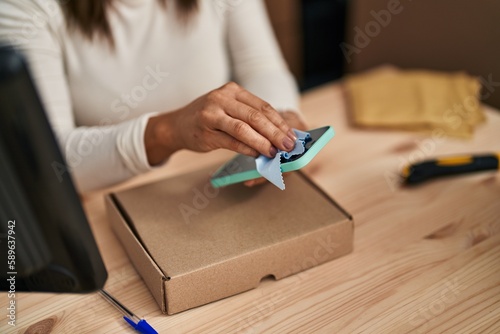 Middle age woman ecommerce business worker cleaning smartphone screen at office