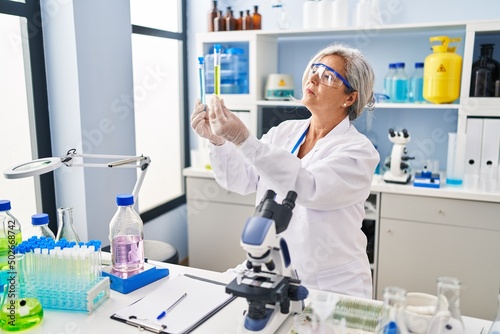 Middle age woman wearing scientist uniform looking test tubes at laboratory
