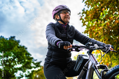 Middle aged beautiful woman riding bicycle in city park in autumn. Side view