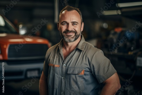 Middle Aged Caucasian car mechanic in a car mechanic shop smiling portrait