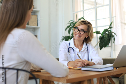 Middle aged female doctor therapist in consultation with patient in office.