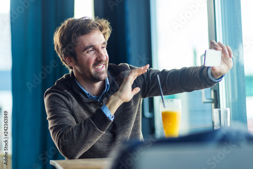 Middle aged handsome man make video call using smartphone