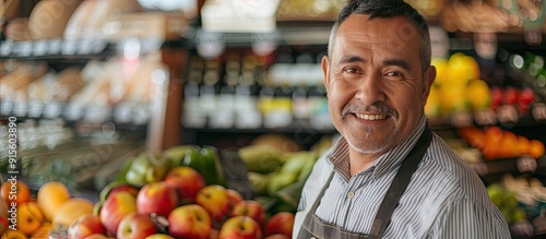 Middle aged Latin man owner of an organic grocery store gazing at the camera with a credit card in hand demonstrating the ease of payment copy space