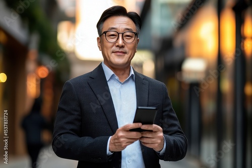 Middle Aged Man Typing. Confident Korean Businessman with Smartphone in City Setting