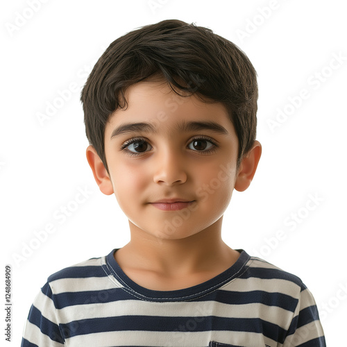 Middle Eastern boy in striped shirt isolated on transparent white background