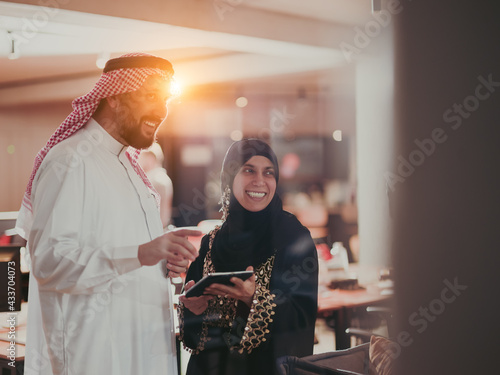 Middle eastern business team in the office working on a tablet computer. Diverse coworkers group in modern open space office in background