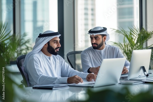 Middle eastern businessmen in traditional emirati attire collaborating in a modern office setting