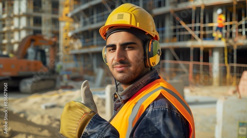 Middle Eastern worker wearing hearing protection at construction site, smiling and giving a thumbs up, promoting safety and positivity in the workplace