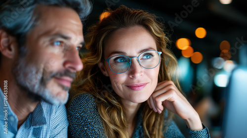 Middle-aged architect listening while younger colleague presents home design on screen, mentorship, teamwork, generational diversity, architecture, with copy space