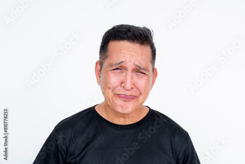 Middle-aged Asian man grimacing after tasting sour candy, isolated on white