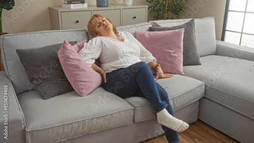 Middle-aged, blonde woman relaxing on sofa in home living room interior with pink and gray pillows, wearing casual white top and jeans, enjoying serene moment indoors.