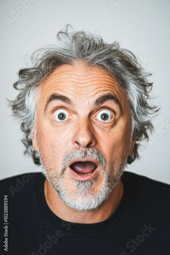 Middle-aged Caucasian granddad with big, bright eyes showing a look of astonishment, his gray hair contrasting beautifully against a white background.