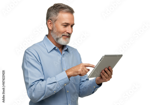 Middle-aged caucasian man with grey beard in light blue shirt holding a silver tablet, confidently interacting on a transparent studio background. Concept of digital proficiency and smart work