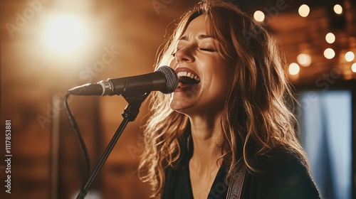 Middle-aged female musician singing in a studio